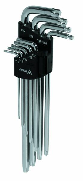 Hosszított TORX kulcs készlet T10-T50 9db profi Asta A-710TX3Hosszított TORX kulcskészlet króm-vanádium acélból. A készlet műanyag hordozóban van tárolva. Technikai paraméterek:Méretek: T10, T15, T20, T25, T27, T30, T40, T45, T50
