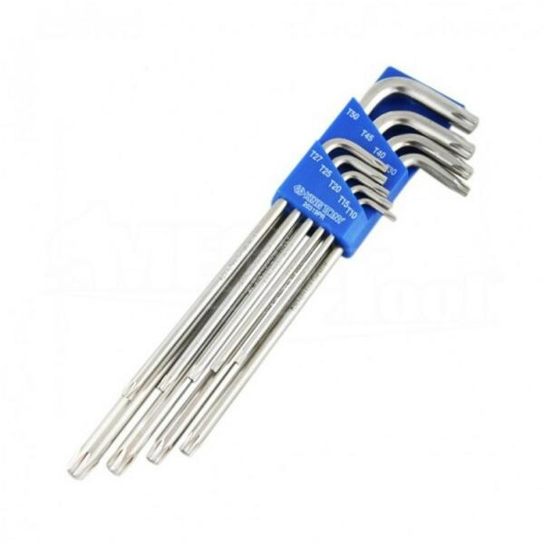 King Tony Torx kulcs készlet 9 db-os extra hosszúA King Tony világméretű cég 1976-os Taiwan-i megalapítása óta törekszik a magas minőségre, a vevői elégedettségre és a munkakörülmények kellemessé tételére. Ipari minőségű termékeire világszerte nagy a kereslet. Kínálatukban megtaláljuk a kézi szerszámokat, elektromos készülékeket, mérőműszereket, tartozékokat. A King Tony 9 db-os készlete a leggyakrabban használt torx kulcsok gyűjteménye. Praktikus kétsoros műanyag szerszámtartó fogja össze, mely akasztható. Extra hosszú kivitelének köszönhetően nehezen hozzáférhető helyeken is könnyen alkalmazható.