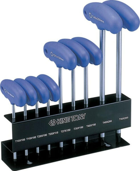 King Tony T-nyelű torx kulcs készlet adatai A torxkulcs méretek: T10 T15 T20 T25 T27 T30 T40 T45 T50 Torx kulcsok anyaga: SNCM + V ötvözött acél, Felületkezelés: krómozott, fekete hegy Műanyag nyél Feketére festett fém tartóban