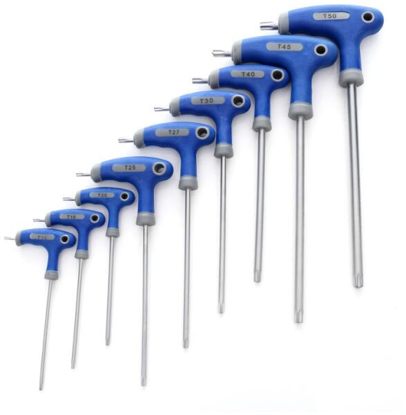 Torx kulcskészlet 9db L-típusú torx kulcskészlet króm-vanádium acélból. Mindkét oldala torx furattal végződik. A fogantyú műanyagból készült, műanyag bevonattal rendelkezik a jobb fogást érdekében. Technikai paraméterek:Kulcs típus: TORXAnyag: króm-vanádium acélDarabszám: 9Méretek: T10 x 100 mmT15 x 100 mmT20 x 100 mmT25 x 150 mmT27 x 150 mmT30 x 150 mmT40 x 150 mmT45 x 200 mmT50 x 200 mm